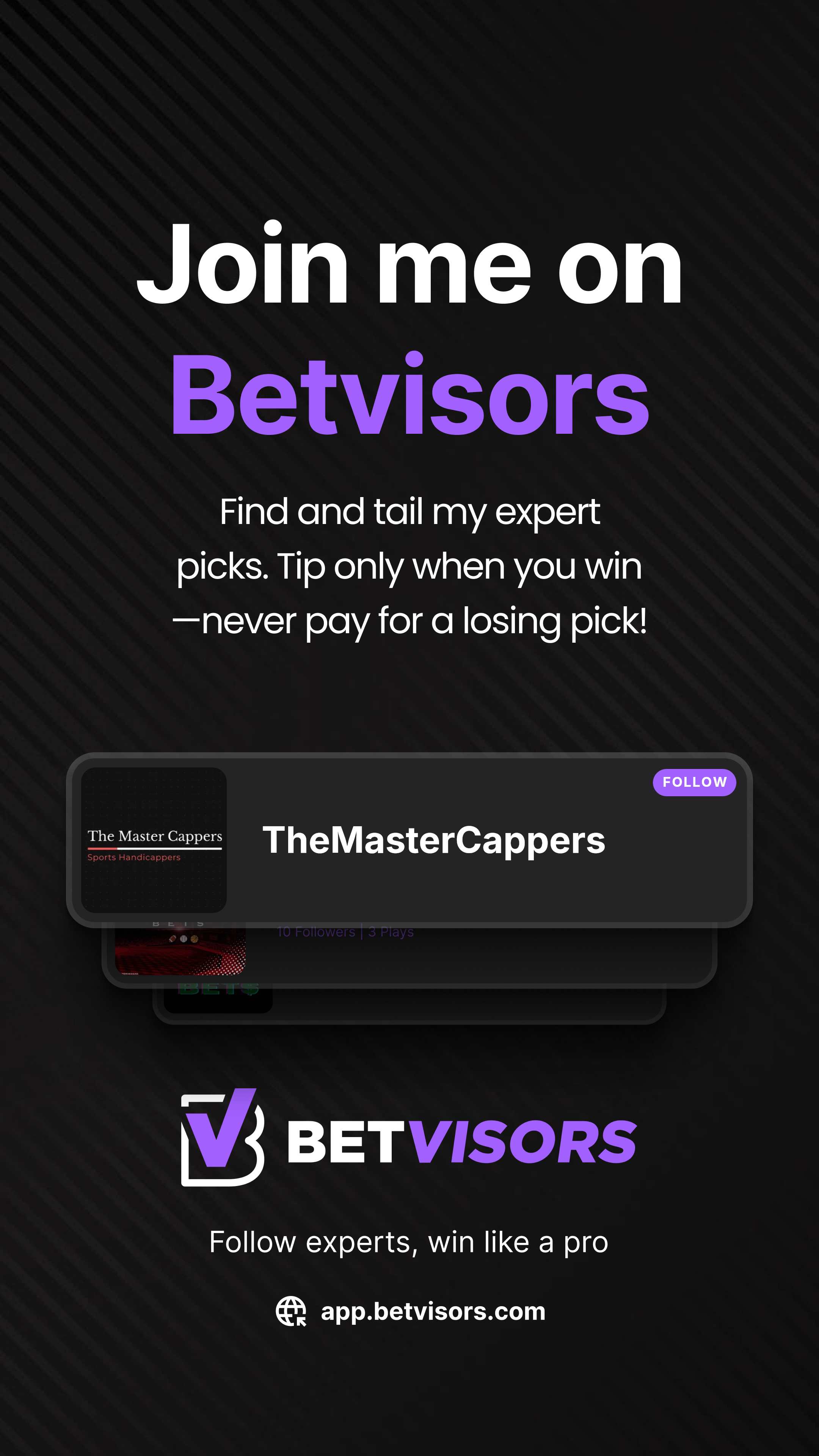 Join Betvisors as an advisor. Post your picks, earn tips only when they win, and get your own branded marketing kit — free.
