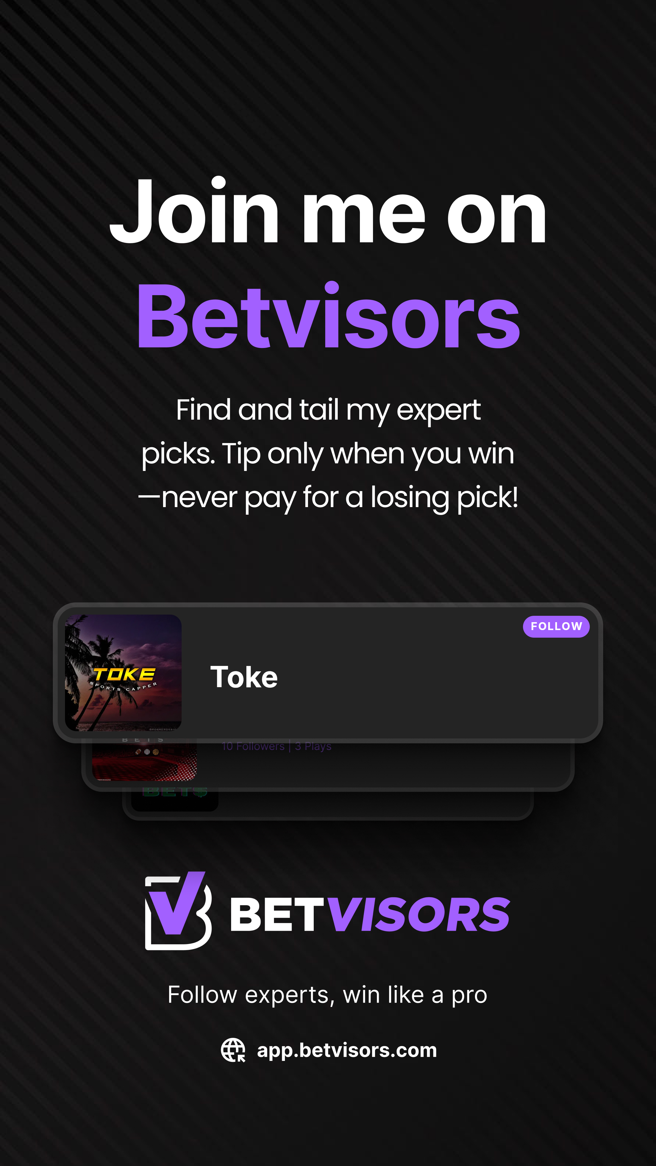 Join Betvisors as an advisor. Post your picks, earn tips only when they win, and get your own branded marketing kit — free.
