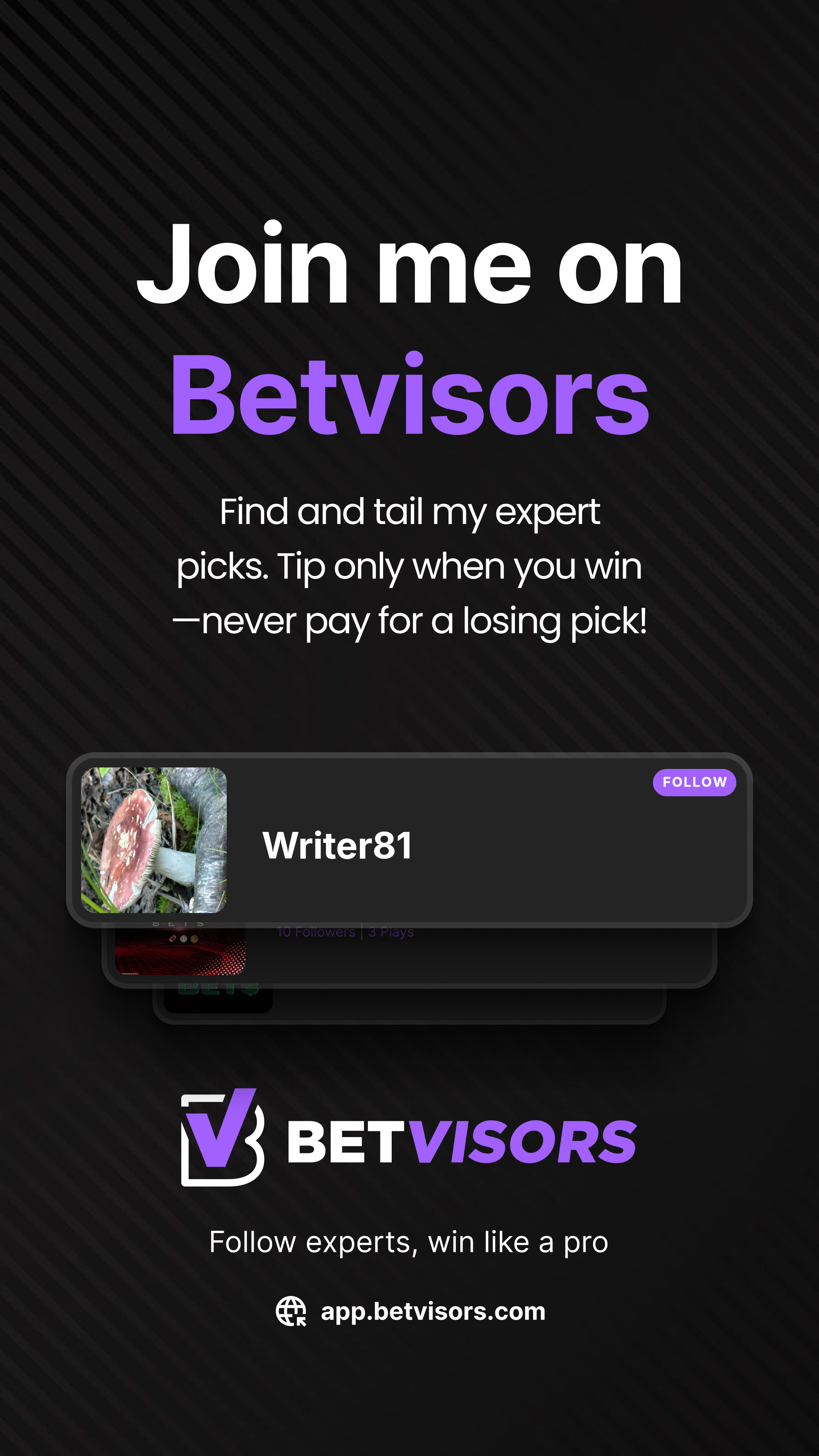 Join Betvisors as an advisor. Post your picks, earn tips only when they win, and get your own branded marketing kit — free.