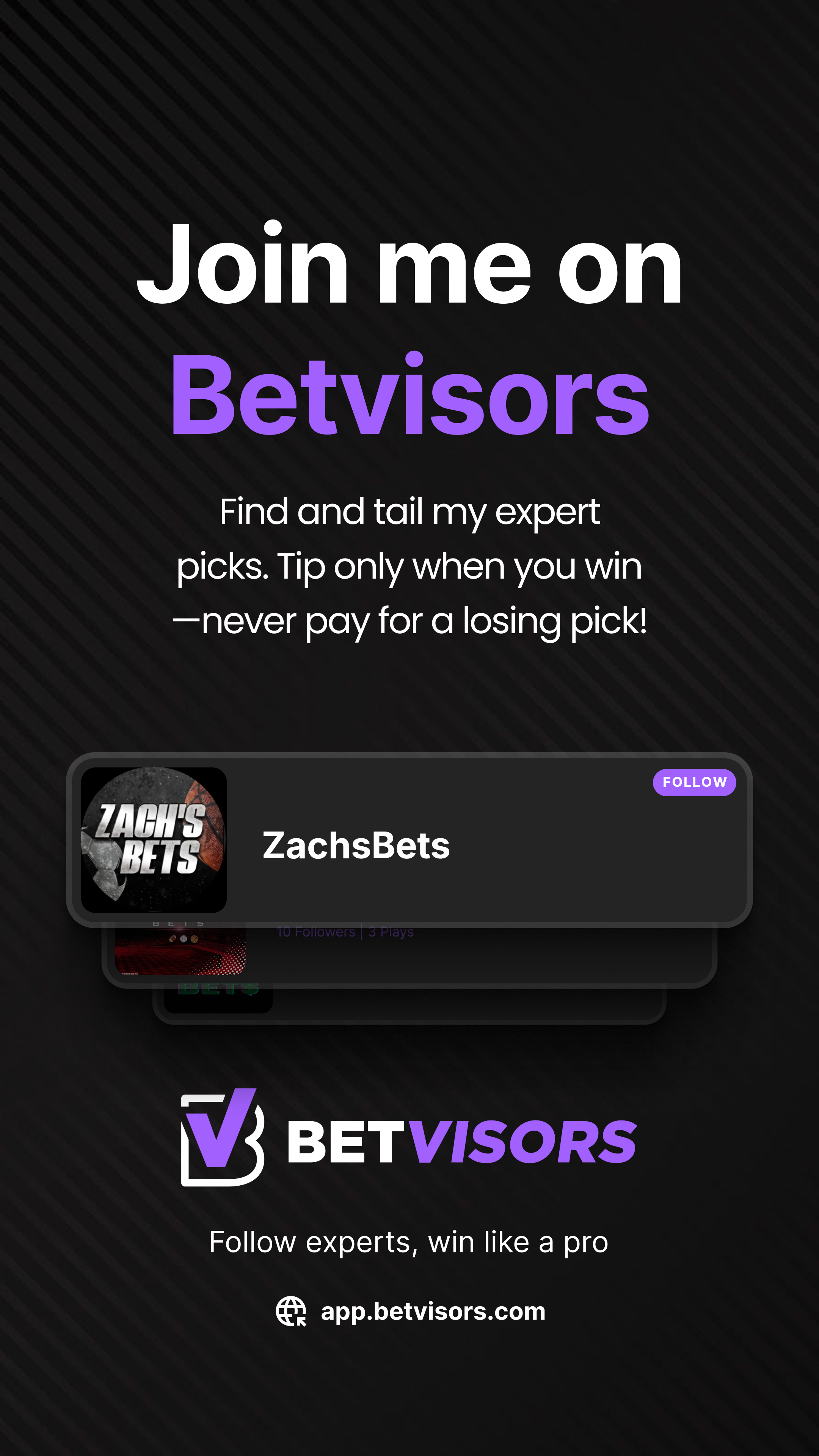 Join Betvisors as an advisor. Post your picks, earn tips only when they win, and get your own branded marketing kit — free.