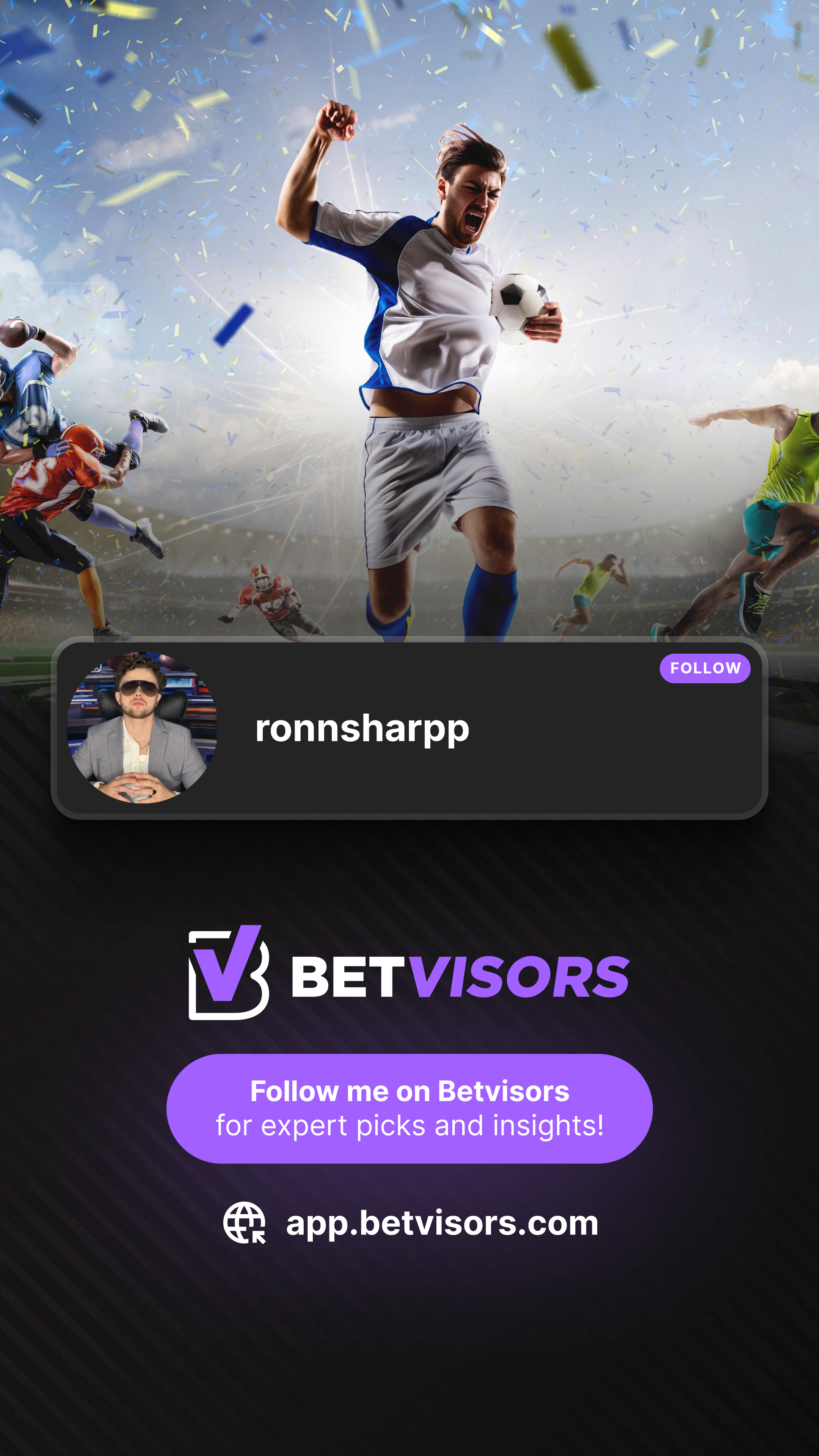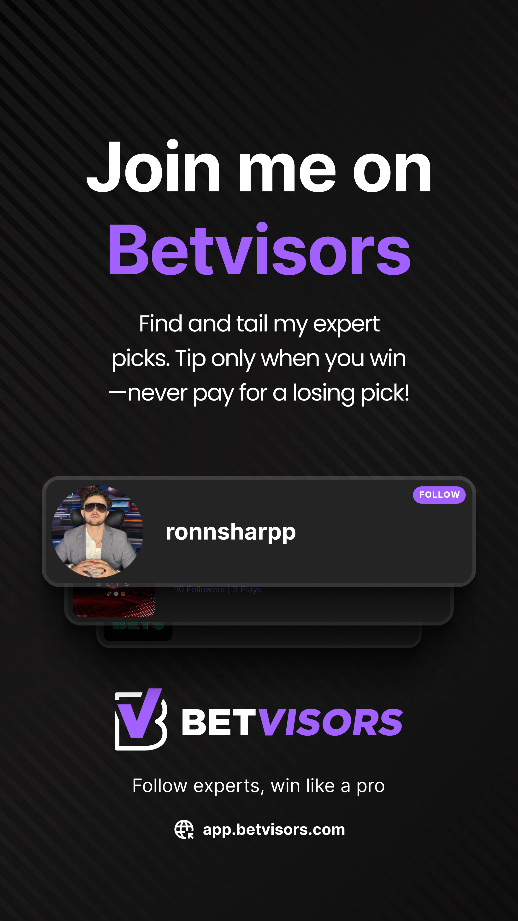 Been posting picks on Betvisors with real money on the line. The model is simple: you tail my picks, and if I win, you tip. If I lose, you owe nothing. No subscriptions. No paywalls. You never pay for a losing pick. I'm putting my record out there because I believe in my picks. Come see for yourself. https://app.betvisors.com/signup?ref=ronnsharpp